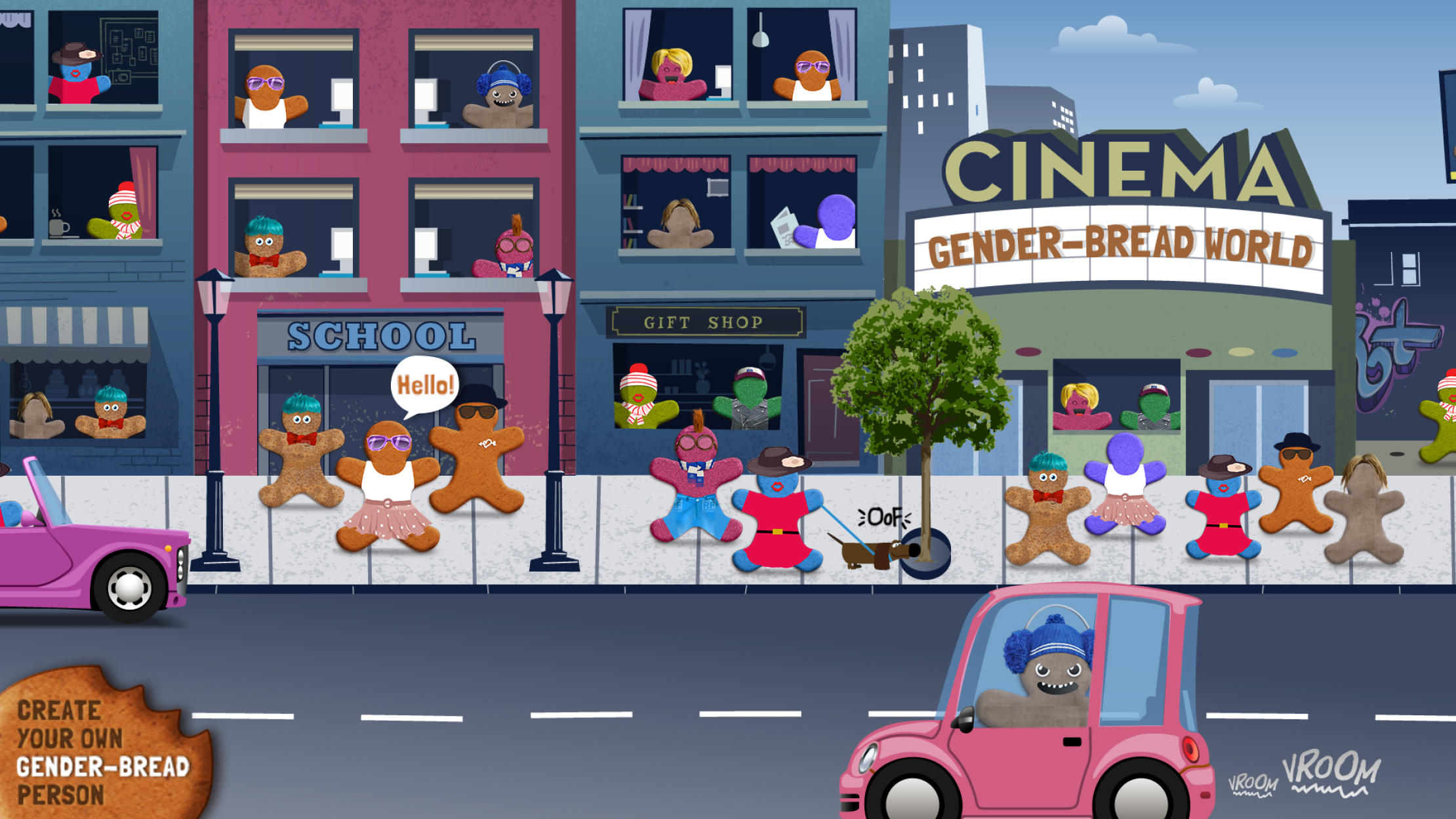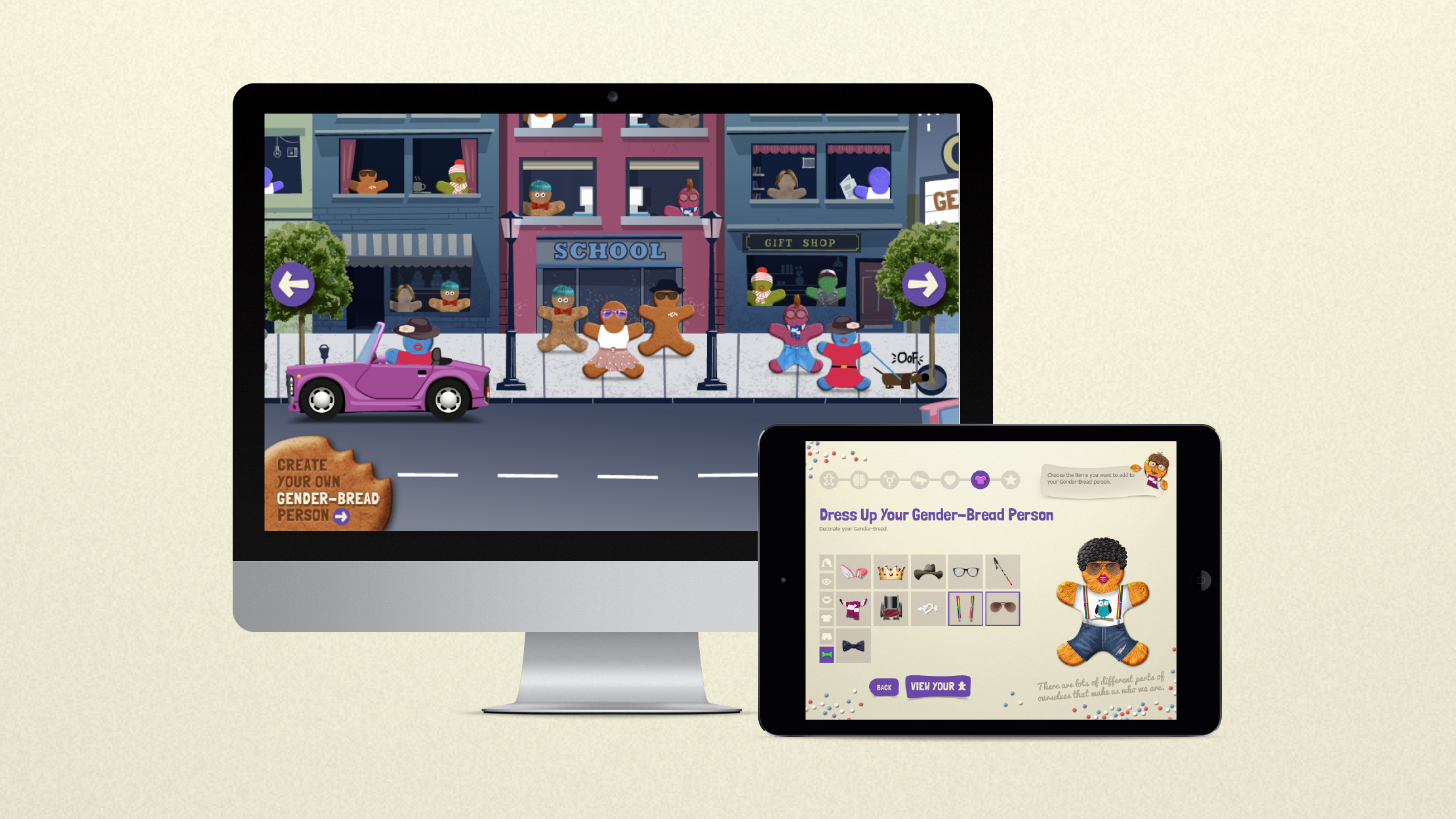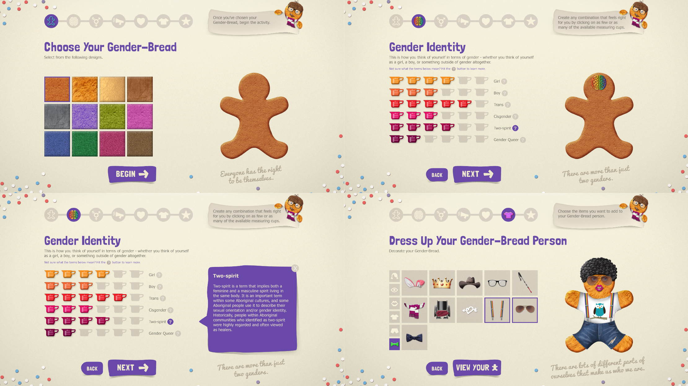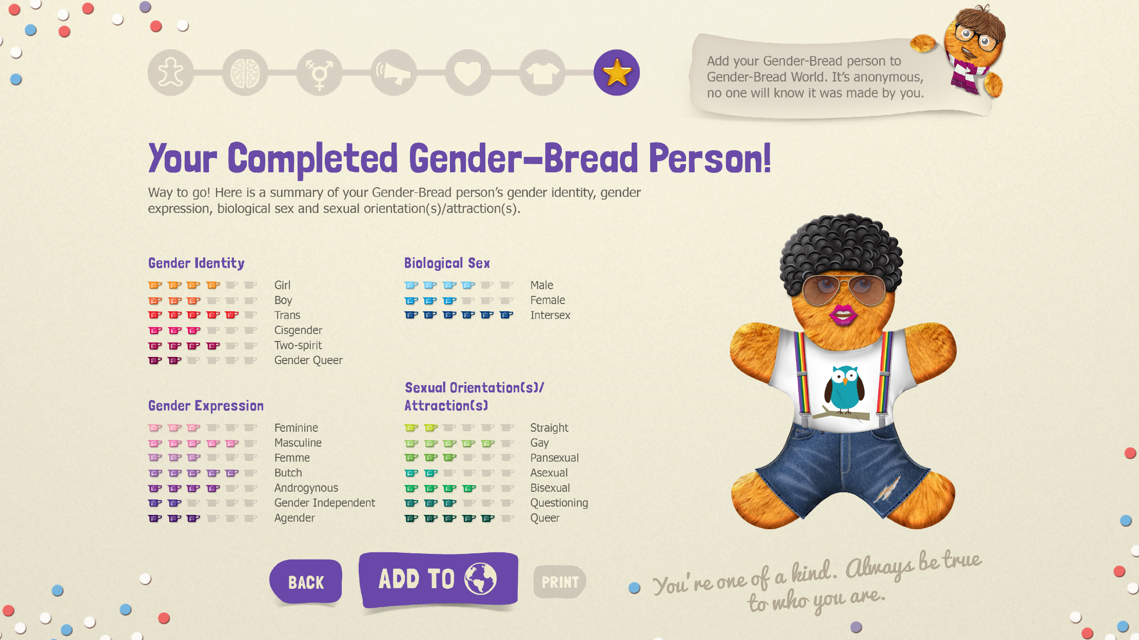 Genderbread interactive tool allowing users to customize a character and add them to a virtual world.